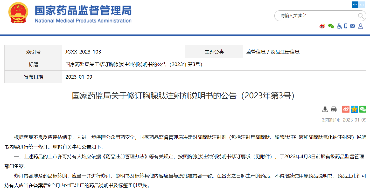 國(guó)家藥監(jiān)局關(guān)于修訂胸腺肽注射劑說(shuō)明書(shū)的公告(2023年第3號(hào))