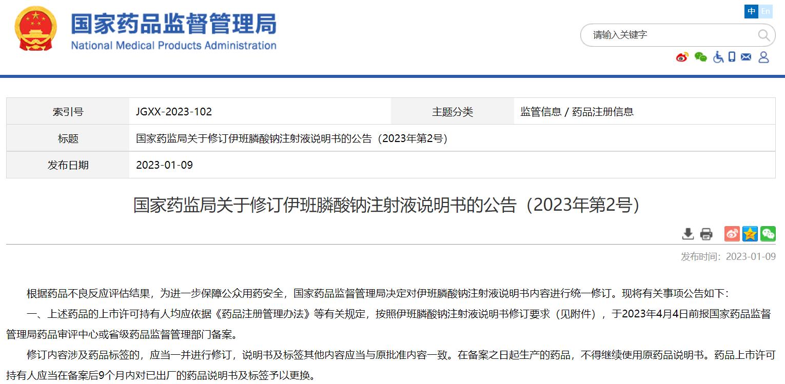 國(guó)家藥監(jiān)局關(guān)于修訂伊班膦酸鈉注射液說(shuō)明書(shū)的公告(2023年第2號(hào))
