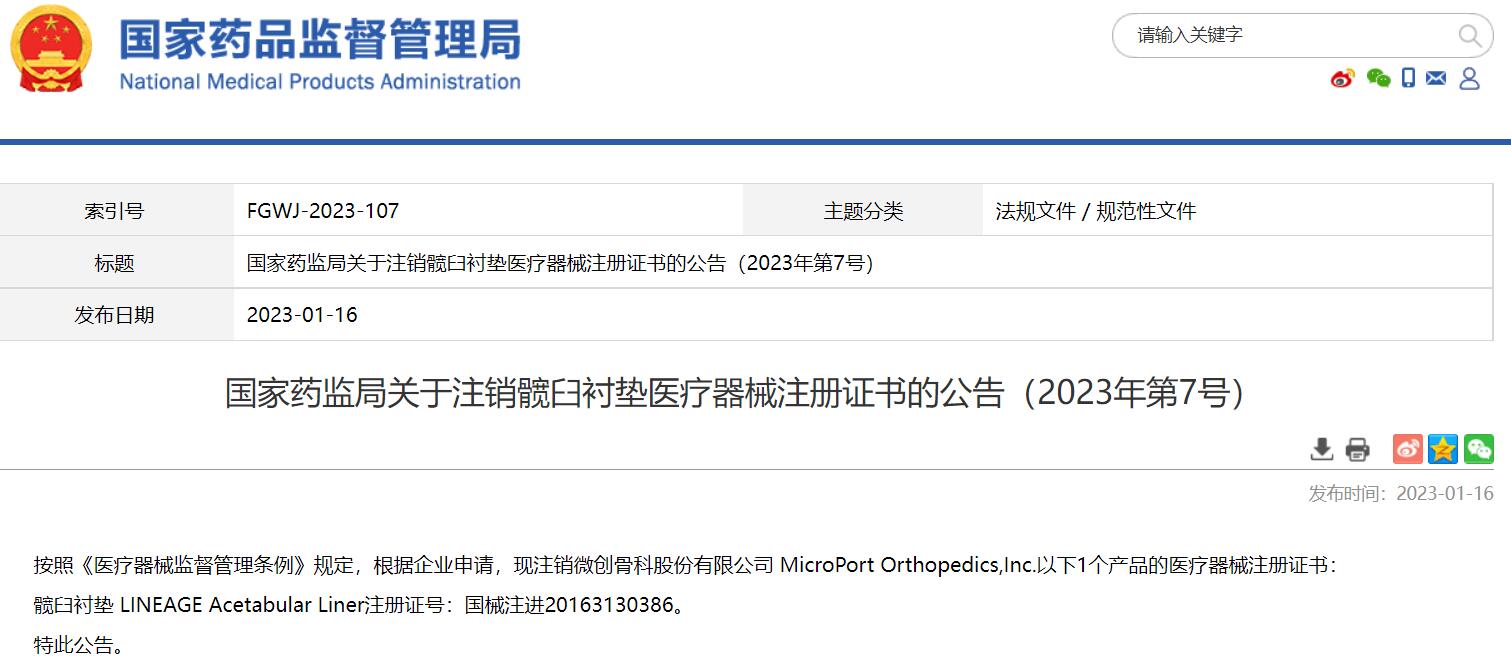 國(guó)家藥監(jiān)局關(guān)于注銷(xiāo)髖臼襯墊醫(yī)療器械注冊(cè)證書(shū)的公告(2023年第7號(hào))
