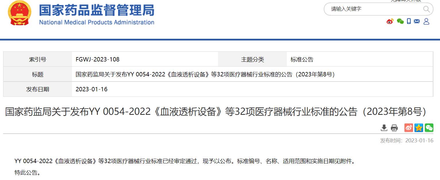 國(guó)家藥監(jiān)局關(guān)于發(fā)布YY 0054-2022《血液透析設(shè)備》等32項(xiàng)醫(yī)療器械行業(yè)標(biāo)準(zhǔn)的公告(2023年第8號(hào))