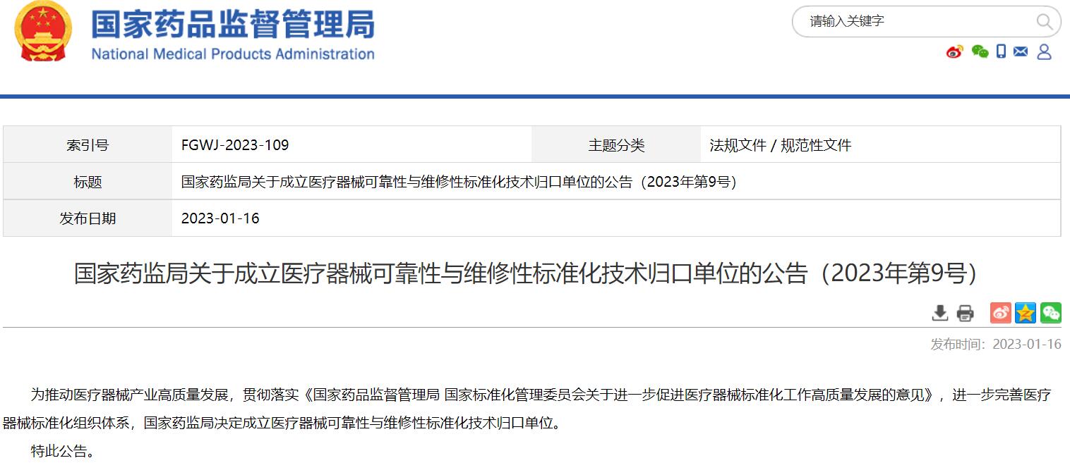 國(guó)家藥監(jiān)局關(guān)于成立醫(yī)療器械可靠性與維修性標(biāo)準(zhǔn)化技術(shù)歸口單位的公告(2023年第9號(hào))