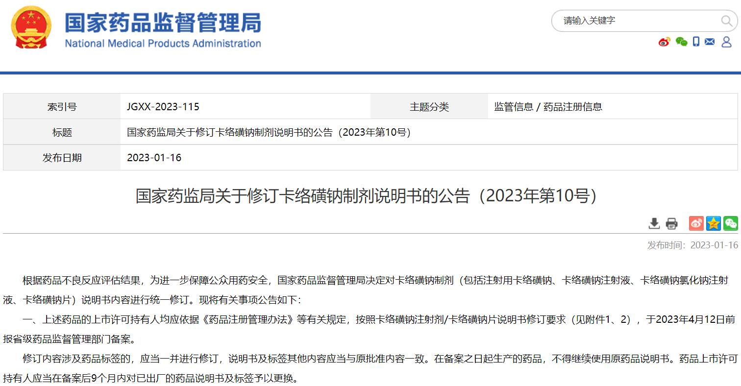 國(guó)家藥監(jiān)局關(guān)于修訂卡絡(luò)磺鈉制劑說(shuō)明書(shū)的公告(2023年第10號(hào))