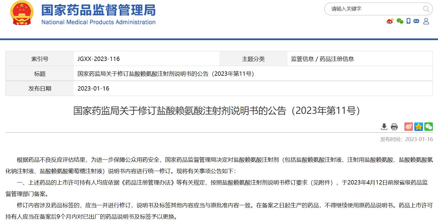 國(guó)家藥監(jiān)局關(guān)于修訂鹽酸賴(lài)氨酸注射劑說(shuō)明書(shū)的公告(2023年第11號(hào))