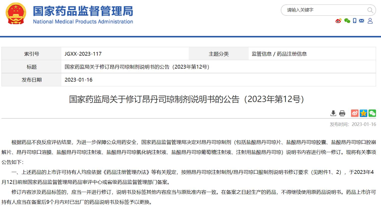 國(guó)家藥監(jiān)局關(guān)于修訂昂丹司瓊制劑說(shuō)明書(shū)的公告(2023年第12號(hào))