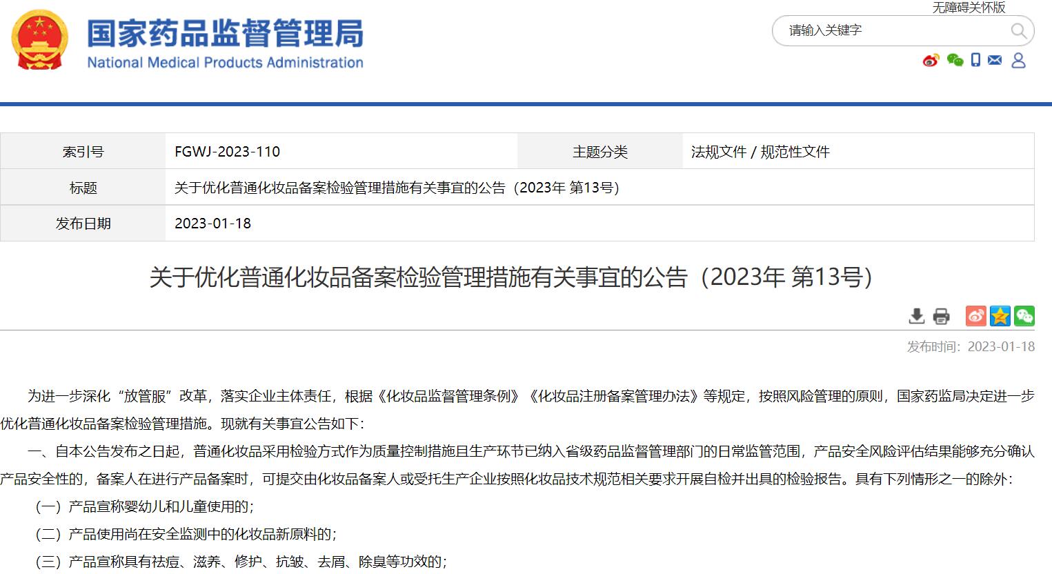 關(guān)于優(yōu)化普通化妝品備案檢驗(yàn)管理措施有關(guān)事宜的公告(2023年 第13號(hào))