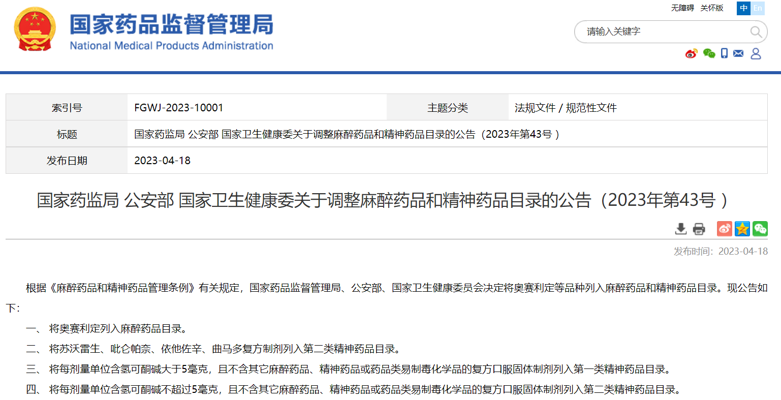國家藥監(jiān)局 公安部 國家衛(wèi)生健康委關(guān)于調(diào)整麻醉藥品和精神藥品目錄的公告(2023年第43號 )