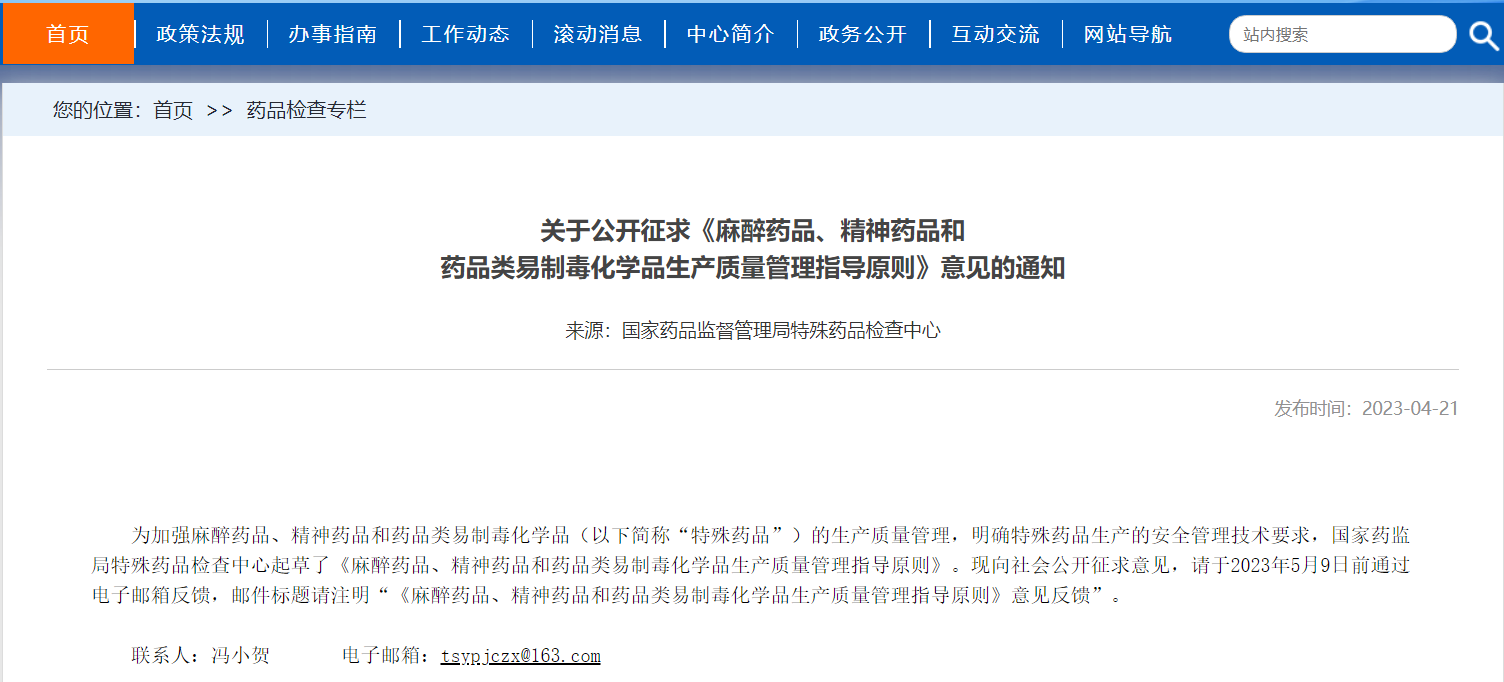 關(guān)于公開征求《麻醉藥品、精神藥品和藥品類易制毒化學(xué)品生產(chǎn)質(zhì)量管理指導(dǎo)原則》意見的通知
