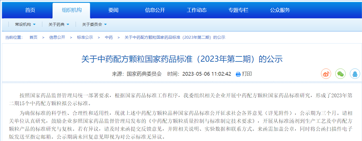 國(guó)家藥典委關(guān)于中藥配方顆粒國(guó)家藥品標(biāo)準(zhǔn)(2023年第二期)的公示