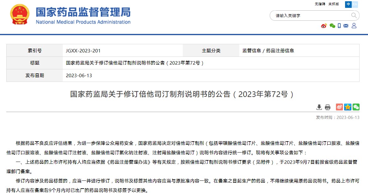 國(guó)家藥監(jiān)局關(guān)于修訂倍他司汀制劑說明書的公告(2023年第72號(hào))