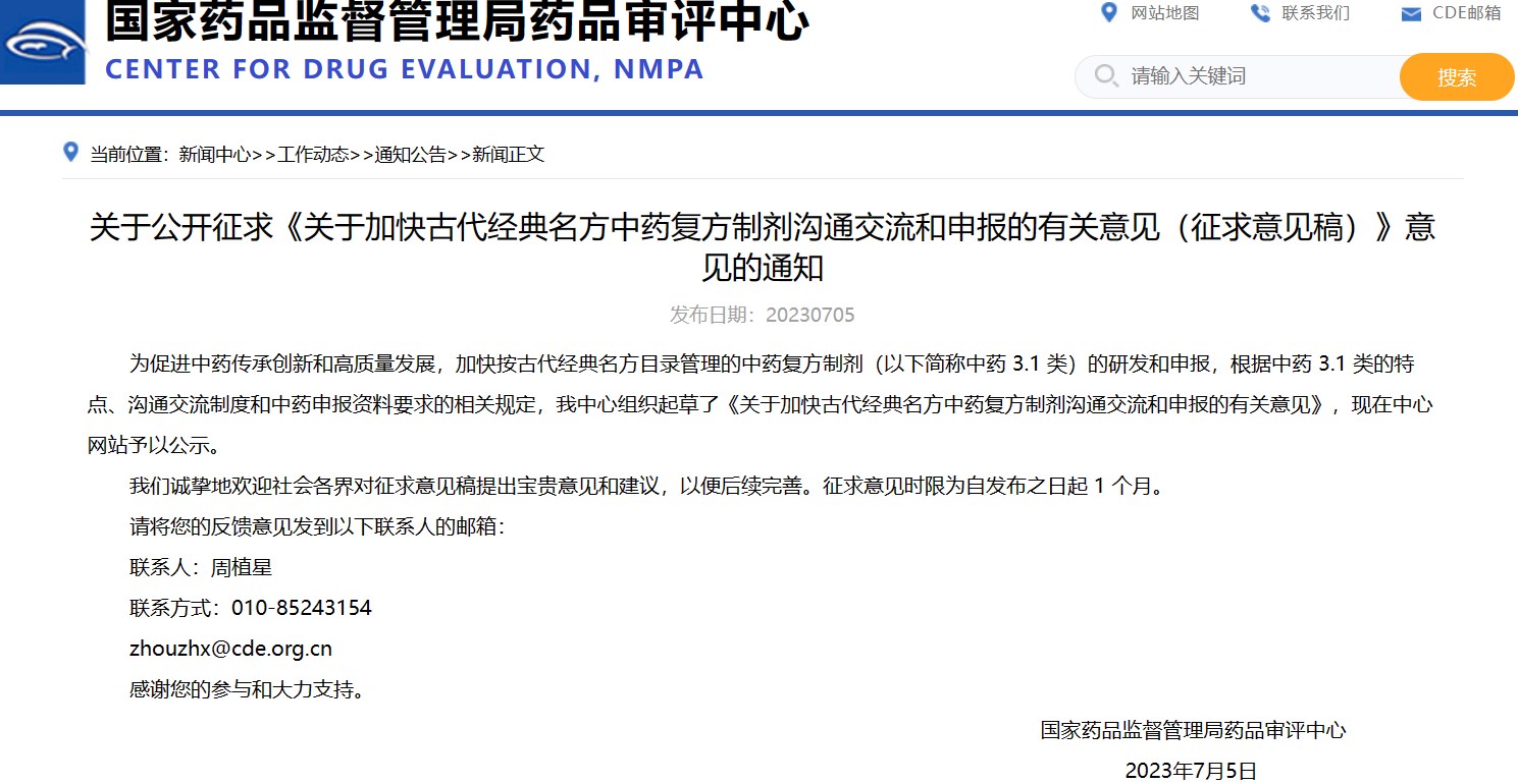 關(guān)于公開征求《關(guān)于加快古代經(jīng)典名方中藥復(fù)方制劑溝通交流和申報的有關(guān)意見(征求意見稿)》意見的通知