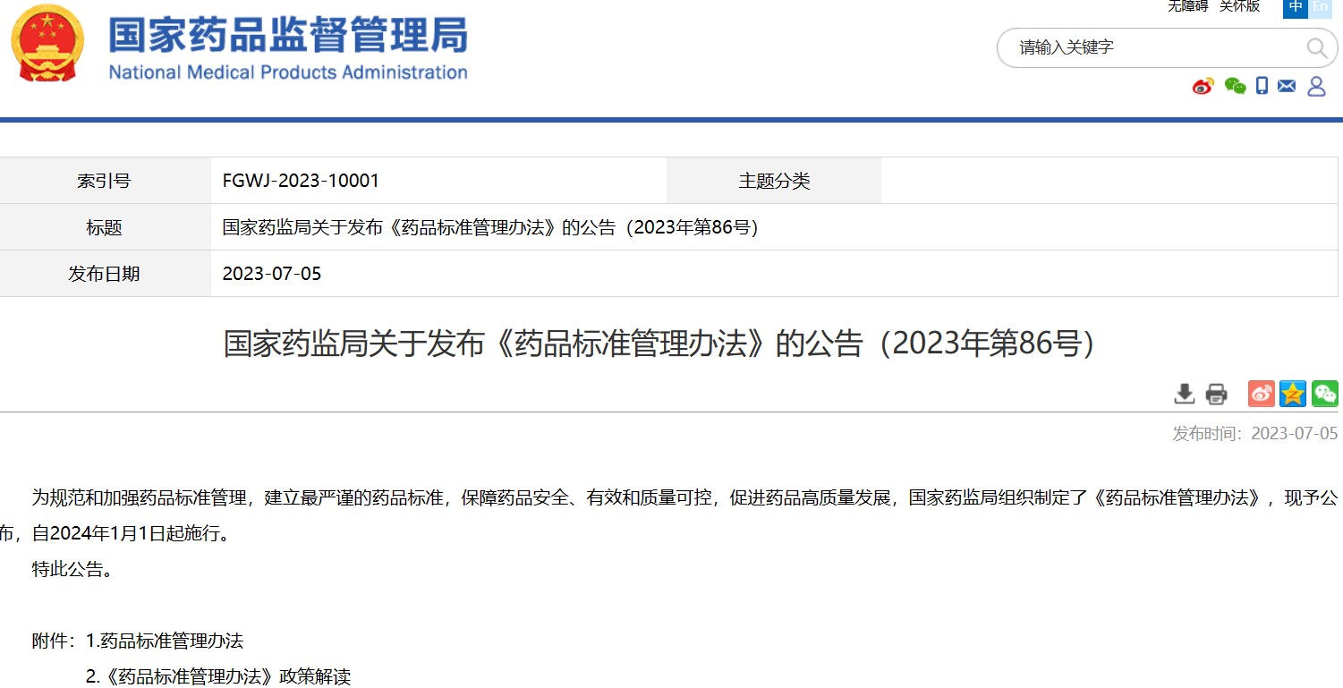 國家藥監(jiān)局關(guān)于發(fā)布《藥品標(biāo)準(zhǔn)管理辦法》的公告(2023年第86號)