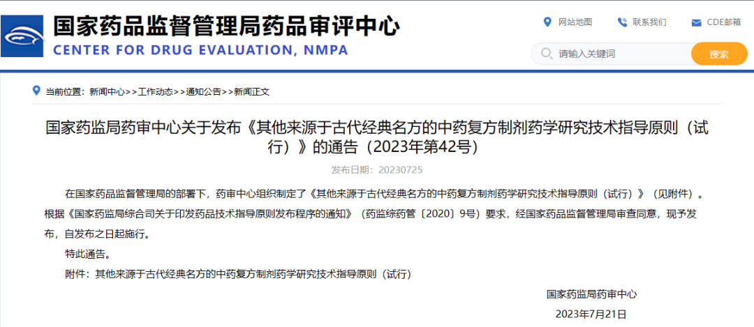 國家藥監(jiān)局藥審中心關(guān)于發(fā)布《其他來源于古代經(jīng)典名方的中藥復(fù)方制劑藥學(xué)研究技術(shù)指導(dǎo)原則(試行)》的通告(2023年第42號(hào))