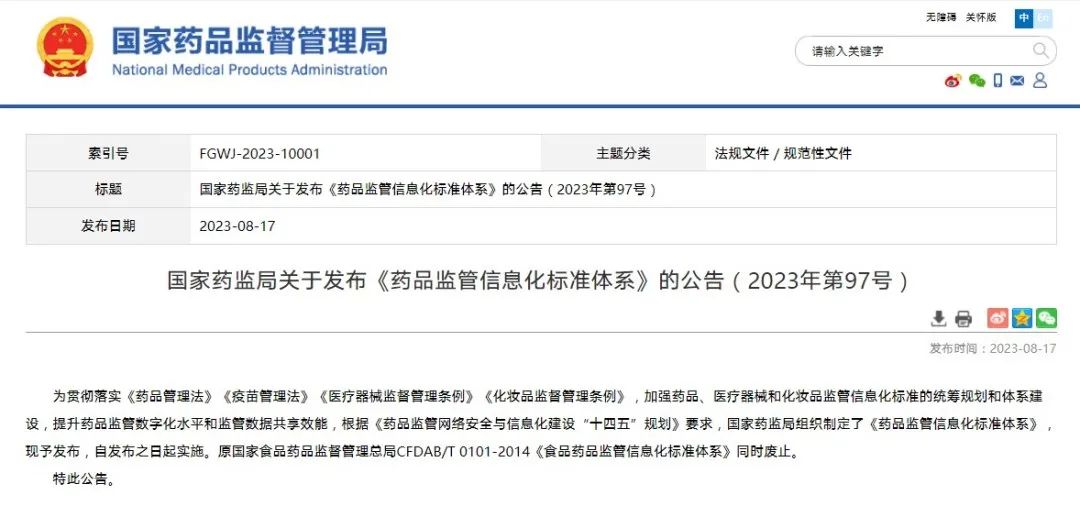 國(guó)家藥監(jiān)局關(guān)于發(fā)布《藥品監(jiān)管信息化標(biāo)準(zhǔn)體系》的公告(2023年第97號(hào))