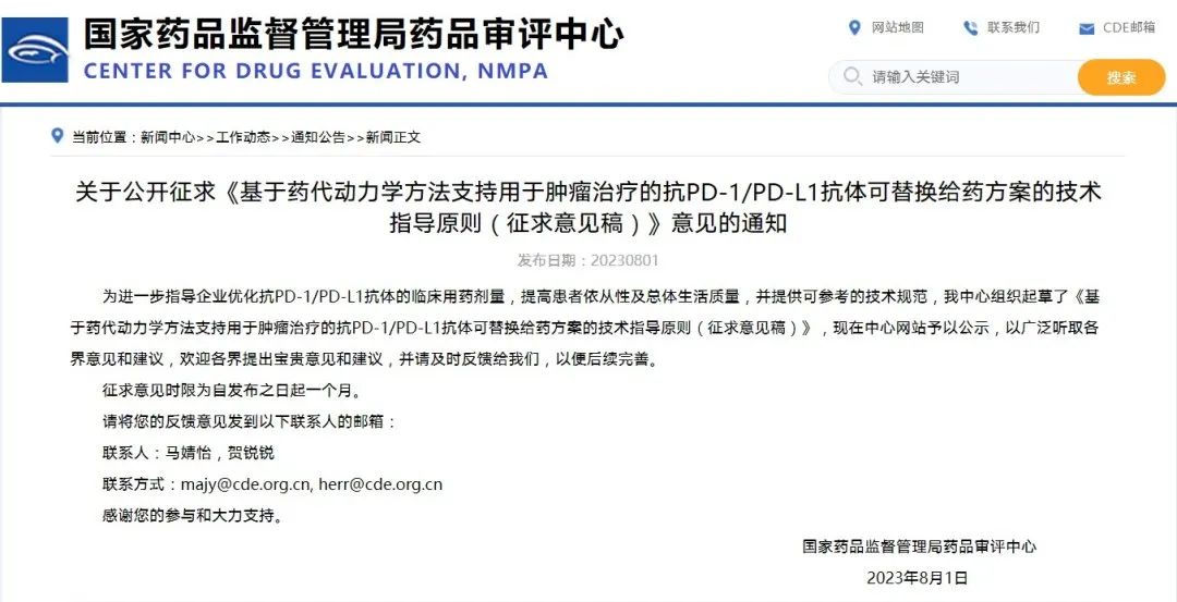 《基于藥代動(dòng)力學(xué)方法支持用于腫瘤治療的抗PD-1/PD-L1抗體可替換給藥方案的技術(shù)指導(dǎo)原則(征求意見稿)》