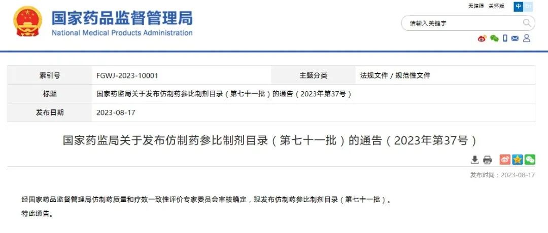 國(guó)家藥監(jiān)局關(guān)于發(fā)布仿制藥參比制劑目錄(第七十一批)的通告(2023年第37號(hào))