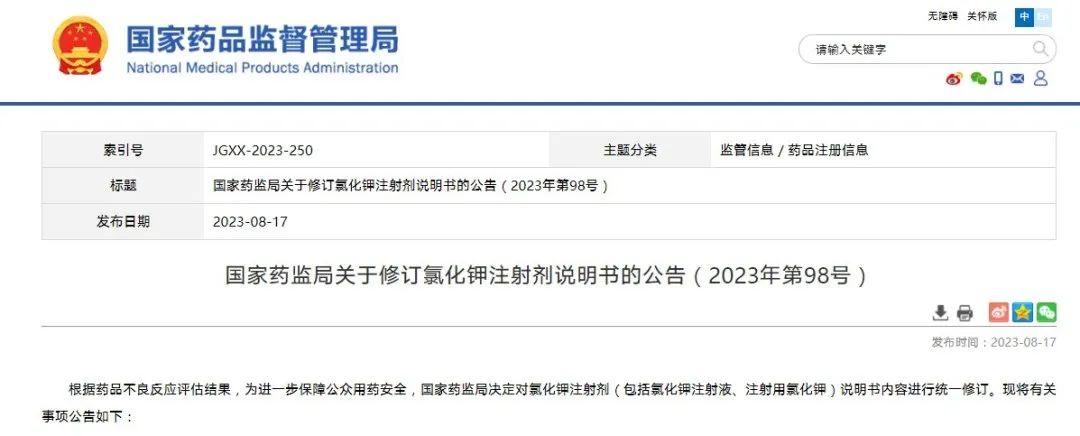 國(guó)家藥監(jiān)局關(guān)于修訂氯化鉀注射劑說明書的公告(2023年第98號(hào))