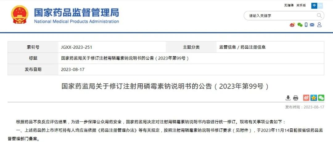 國(guó)家藥監(jiān)局關(guān)于修訂注射用磷霉素鈉說明書的公告(2023年第99號(hào))