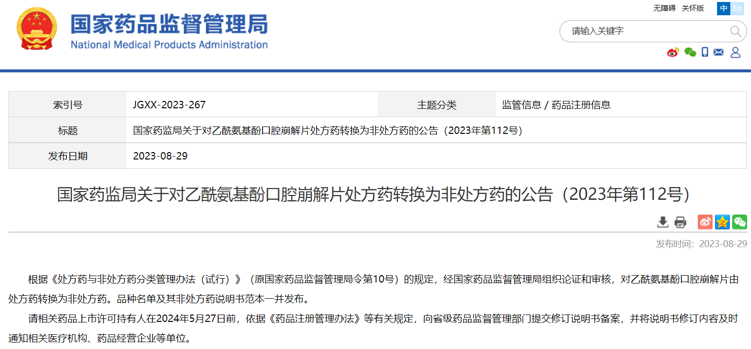國(guó)家藥監(jiān)局關(guān)于對(duì)乙酰氨基酚口腔崩解片處方藥轉(zhuǎn)換為非處方藥的公告(2023年第112號(hào))