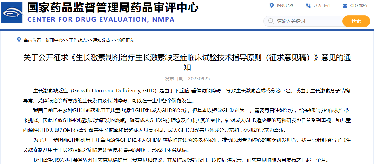 關(guān)于公開征求《生長激素制劑治療生長激素缺乏癥臨床試驗(yàn)技術(shù)指導(dǎo)原則(征求意見稿)》意見的通知