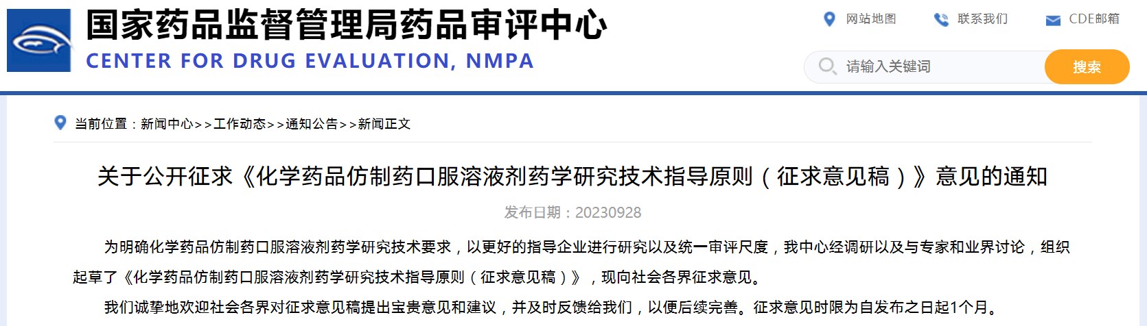 關于公開征求《化學藥品仿制藥口服溶液劑藥學研究技術指導原則》意見的通知