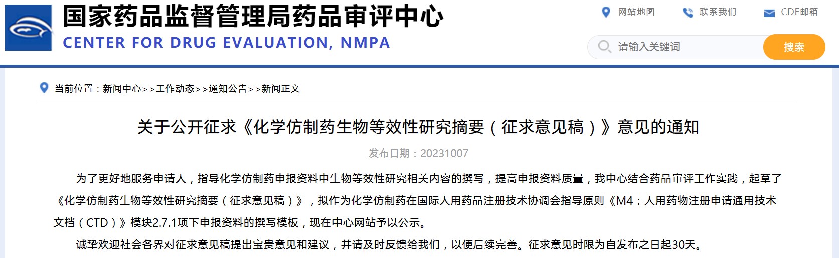 關于公開征求《化學仿制藥生物等效性研究摘要》意見的通知