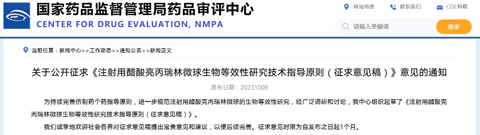 關于公開征求《注射用醋酸亮丙瑞林微球生物等效性研究技術指導原則(征求意見稿)》意見的通知