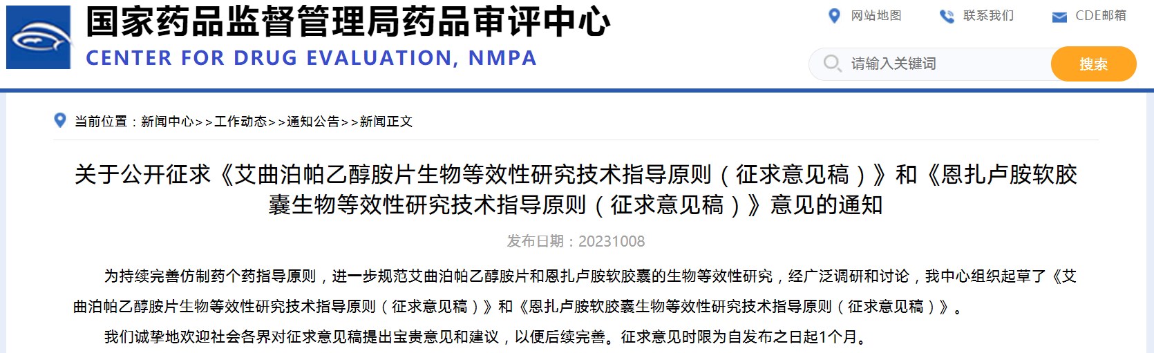 關于公開征求《艾曲泊帕乙醇胺片生物等效性研究技術指導原則(征求意見稿)》和《恩扎盧胺軟膠囊生物等效性研究技術指導原則(征求意見稿)》意見的通知