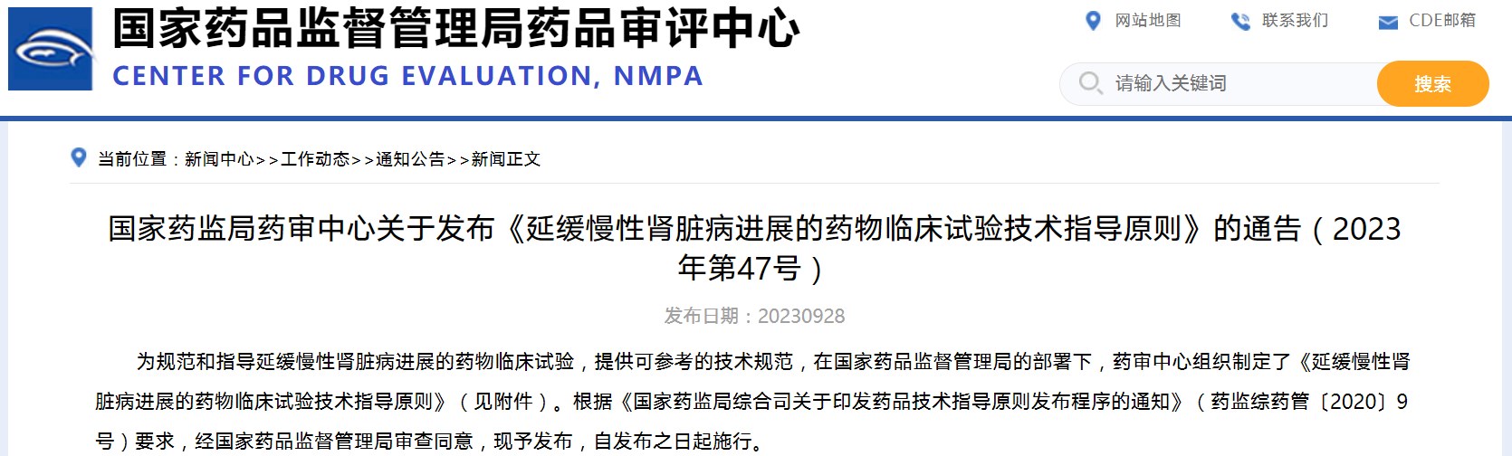 國家藥監(jiān)局藥審中心關于發(fā)布《延緩慢性腎臟病進展的藥物臨床試驗技術指導原則》的通告(2023年第47號)