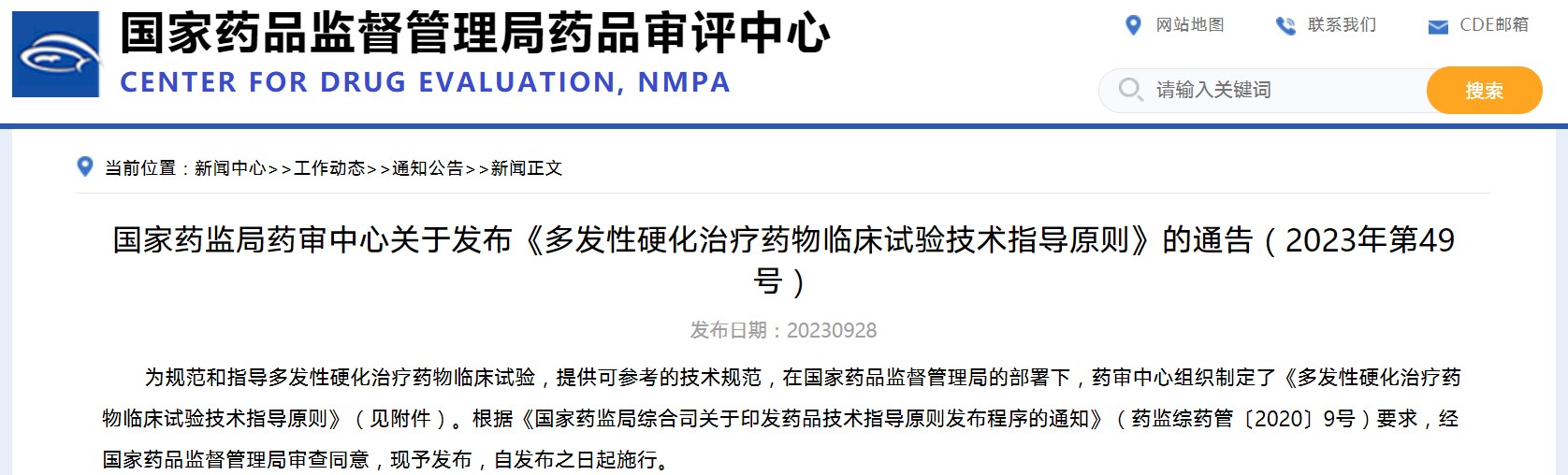 國家藥監(jiān)局藥審中心關于發(fā)布《多發(fā)性硬化治療藥物臨床試驗技術指導原則》的通告(2023年第49號)