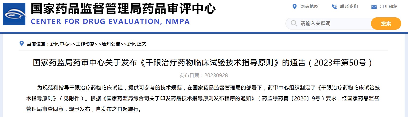 國家藥監(jiān)局藥審中心關于發(fā)布《干眼治療藥物臨床試驗技術指導原則》的通告(2023年第50號)
