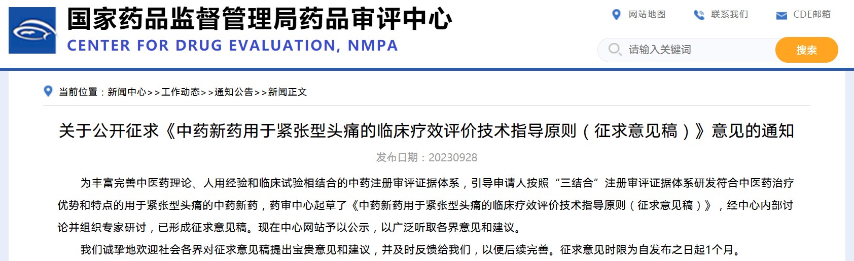 關于公開征求《中藥新藥用于緊張型頭痛的臨床療效評價技術指導原則(征求意見稿)》意見的通知