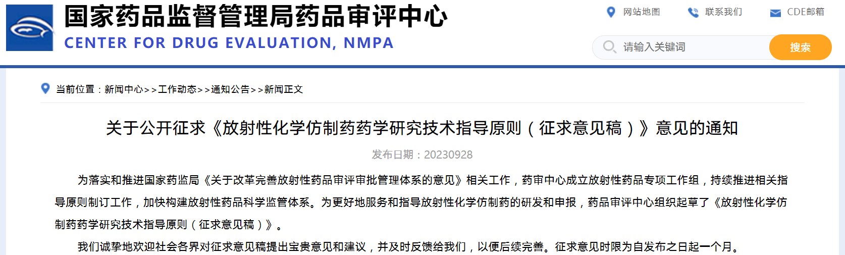 關于公開征求《放射性化學仿制藥藥學研究技術指導原則(征求意見稿)》意見的通知