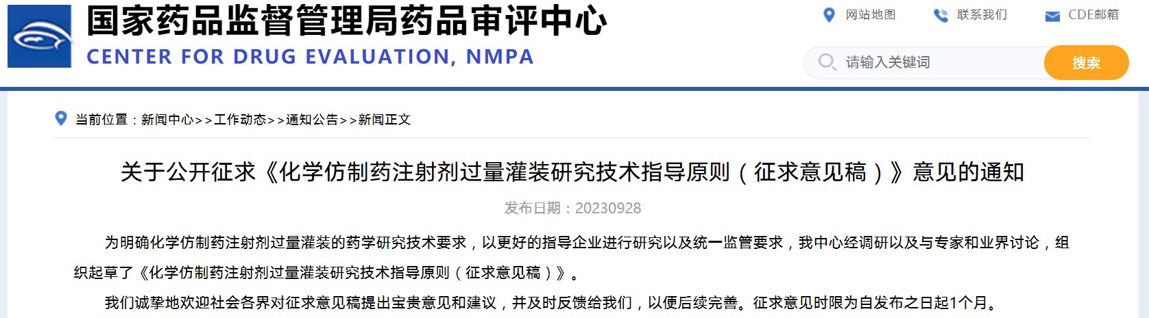 關于公開征求《化學仿制藥注射劑過量灌裝研究技術指導原則(征求意見稿)》意見的通知