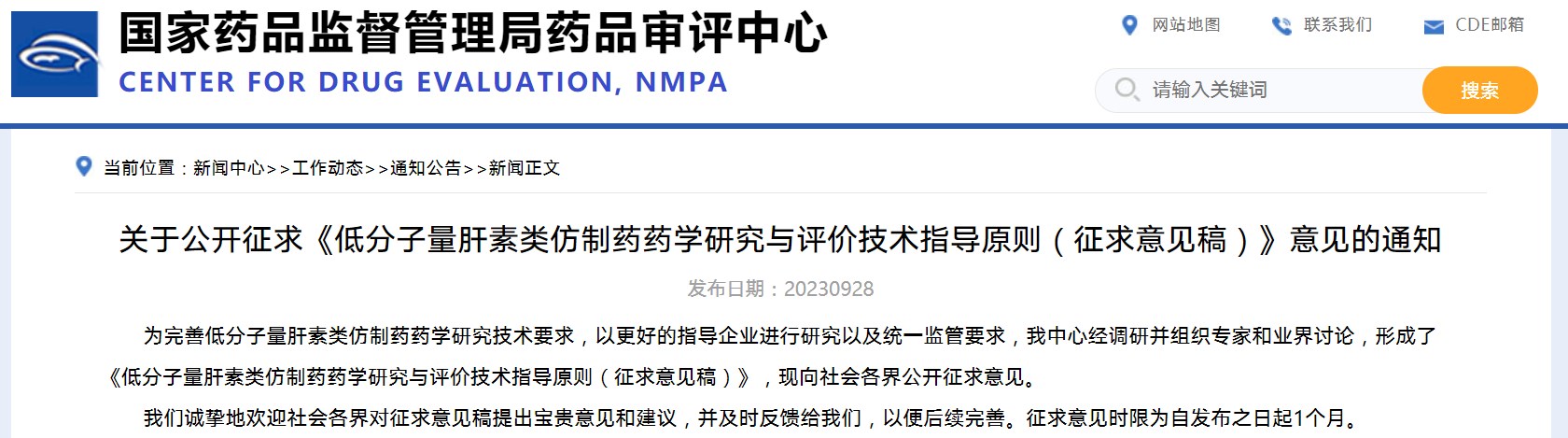 關于公開征求《低分子量肝素類仿制藥藥學研究與評價技術指導原則(征求意見稿)》意見的通知