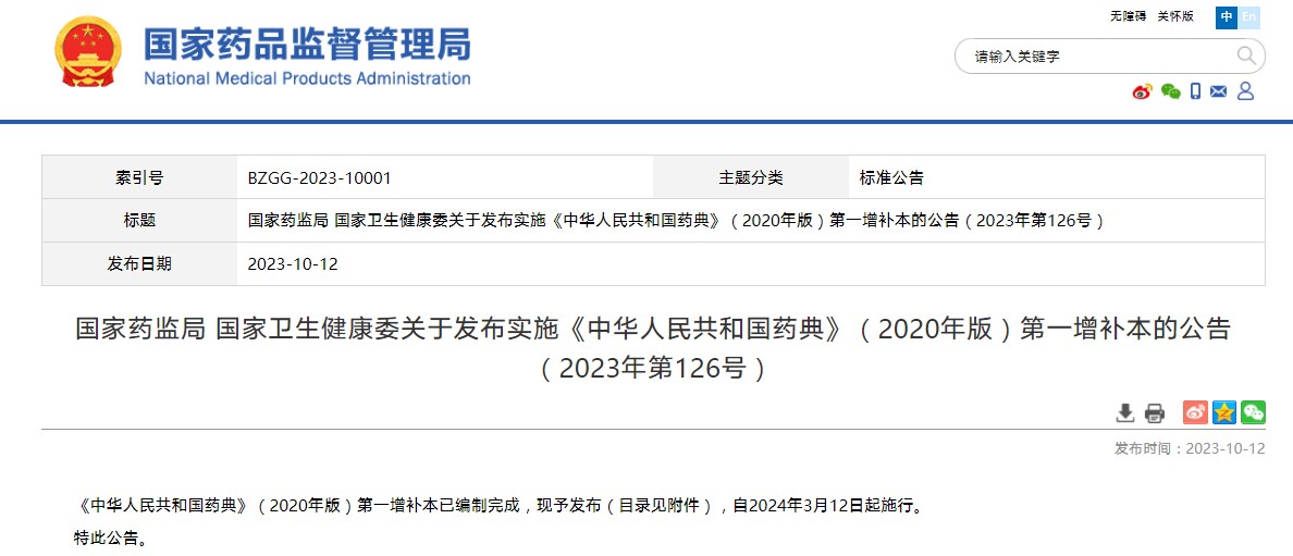 國家藥監(jiān)局 國家衛(wèi)生健康委關于發(fā)布實施《中華人民共和國藥典》(2020年版)第一增補本的公告(2023年第126號)