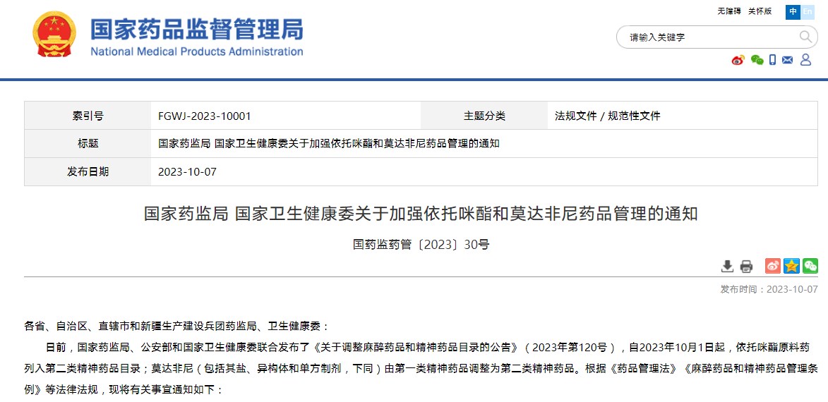 國家藥監(jiān)局 國家衛(wèi)生健康委關于加強依托咪酯和莫達非尼藥品管理的通知