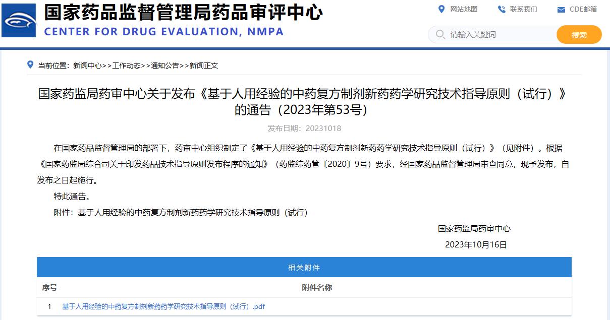 國家藥監(jiān)局藥審中心關(guān)于發(fā)布《基于人用經(jīng)驗的中藥復(fù)方制劑新藥藥學(xué)研究技術(shù)指導(dǎo)原則(試行)》的通告(2023年第53號)