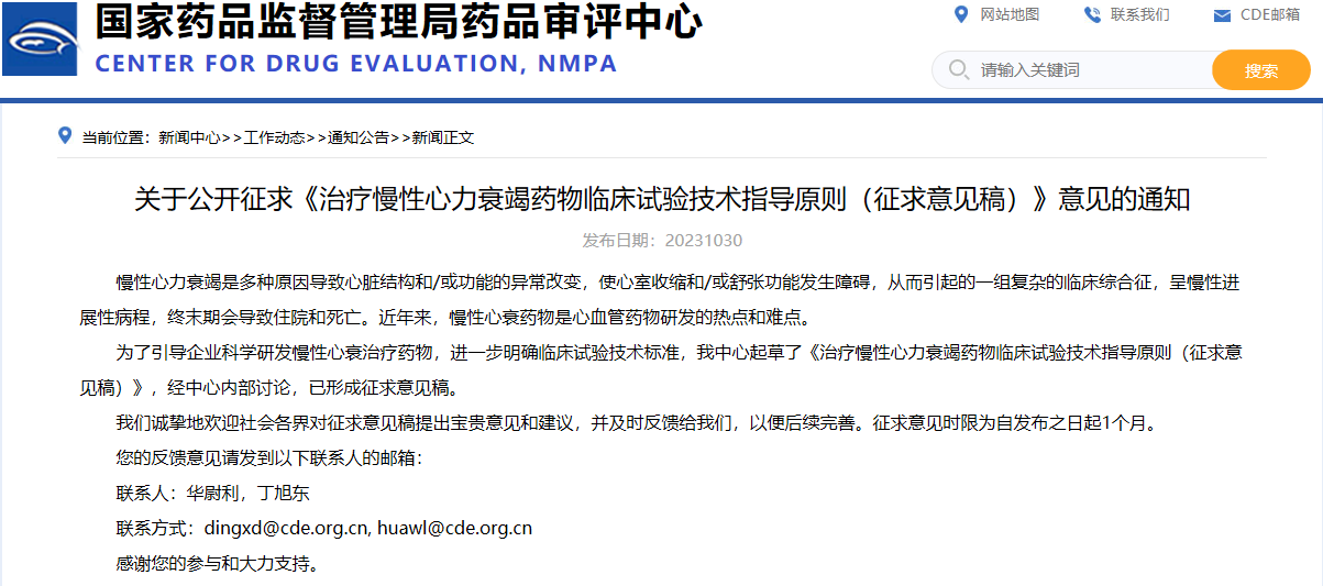 關(guān)于公開征求《治療慢性心力衰竭藥物臨床試驗技術(shù)指導(dǎo)原則(征求意見稿)》意見的通知