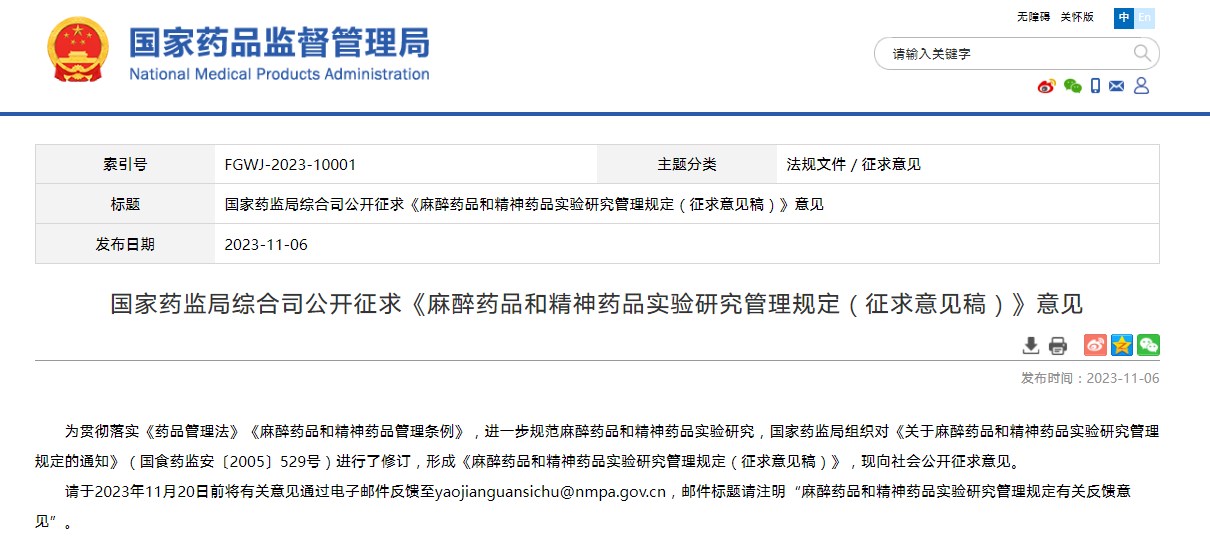 國家藥監(jiān)局綜合司公開征求《麻醉藥品和精神藥品實驗研究管理規(guī)定(征求意見稿)》意見