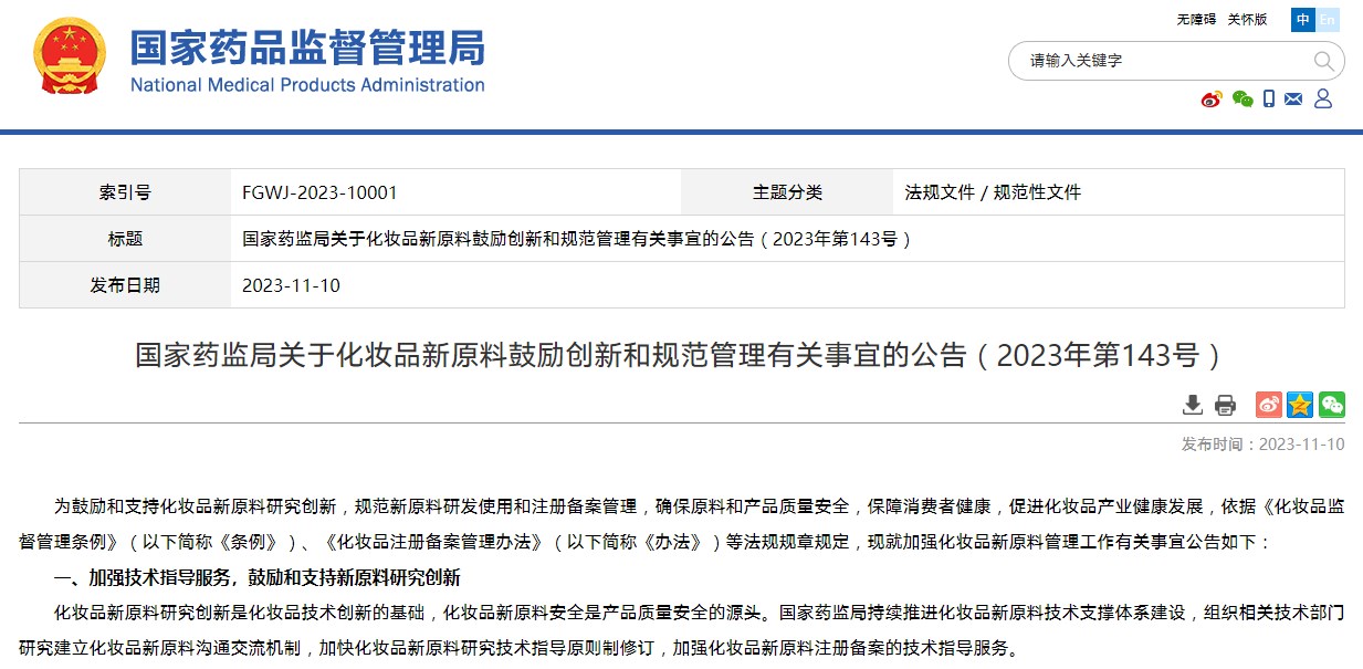 國家藥監(jiān)局關(guān)于化妝品新原料鼓勵創(chuàng)新和規(guī)范管理有關(guān)事宜的公告(2023年第143號)