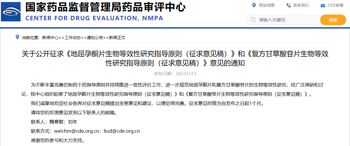 關(guān)于公開(kāi)征求《地屈孕酮片生物等效性研究指導(dǎo)原則(征求意見(jiàn)稿)》和《復(fù)方甘草酸苷片生物等效性研究指導(dǎo)原則(征求意見(jiàn)稿)》意見(jiàn)的通知
