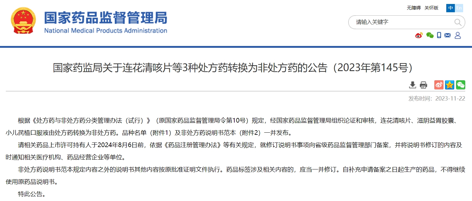 國(guó)家藥監(jiān)局關(guān)于連花清咳片等3種處方藥轉(zhuǎn)換為非處方藥的公告(2023年第145號(hào))