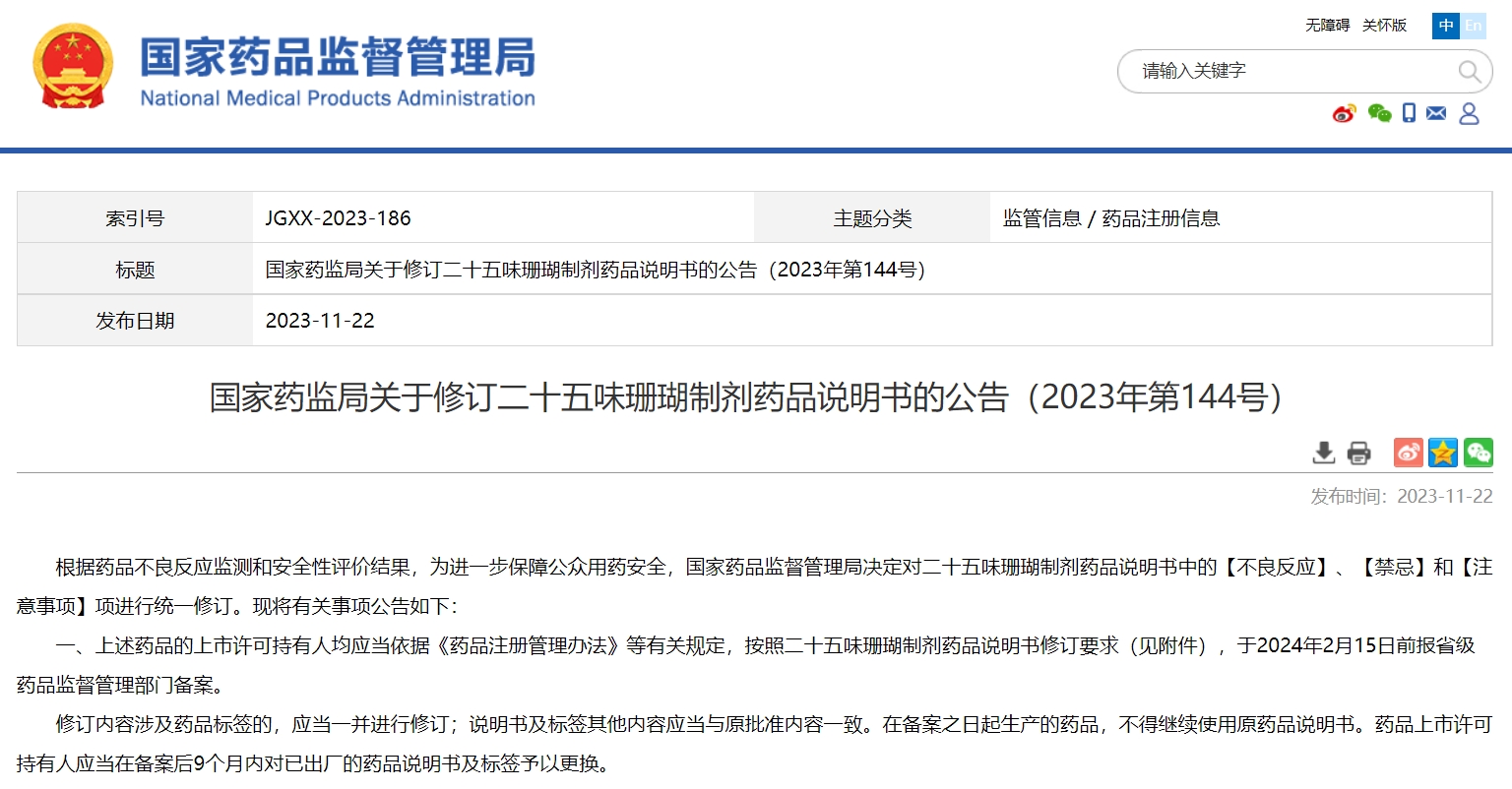 國(guó)家藥監(jiān)局關(guān)于修訂二十五味珊瑚制劑藥品說(shuō)明書(shū)的公告(2023年第144號(hào))