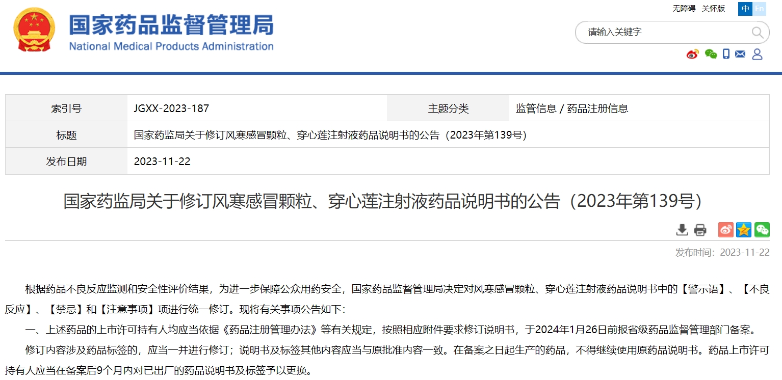 國(guó)家藥監(jiān)局關(guān)于修訂風(fēng)寒感冒顆粒、穿心蓮注射液藥品說(shuō)明書(shū)的公告(2023年第139號(hào))