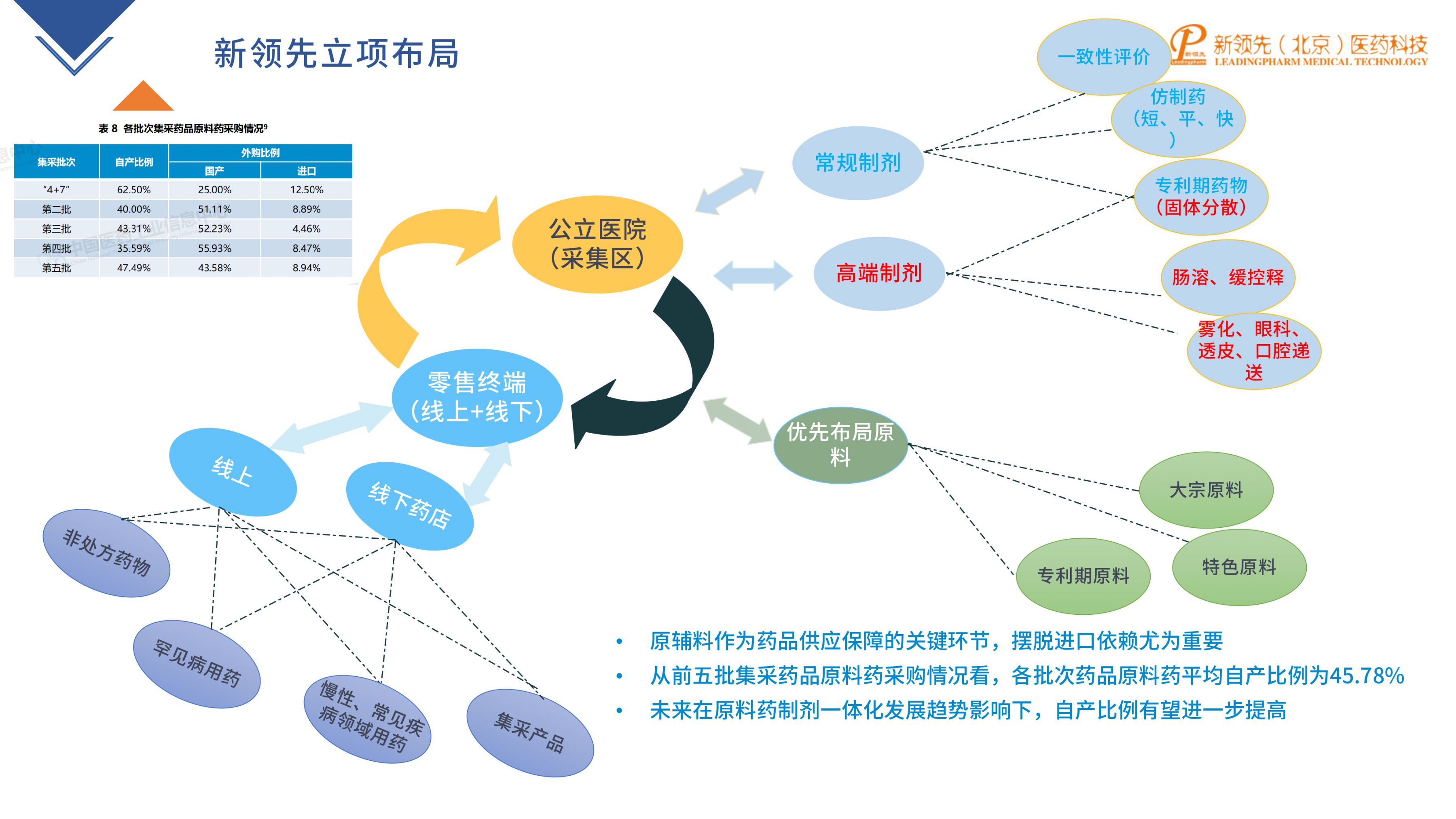 對(duì)于不同的銷售渠道,我們結(jié)合渠道特性,布局相適應(yīng)的產(chǎn)品。例如對(duì)于以公立醫(yī)院渠道為主的企業(yè),可以開展常規(guī)制劑的一致性評(píng)價(jià)、短平快仿制藥作為短期布局,專利期產(chǎn)品(如固體分散體)、腸溶/緩控釋/霧化/透皮/眼科/口腔遞送等高端制劑的改良創(chuàng)新可作為中長(zhǎng)期布局,并進(jìn)行產(chǎn)品管線的生命周期管理;為了應(yīng)對(duì)集采,可優(yōu)先布局原料,未來(lái)在原料藥制劑一體化發(fā)展趨勢(shì)影響下,自產(chǎn)比例有望進(jìn)一步提高。此外,對(duì)于具有零售渠道優(yōu)勢(shì)的企業(yè),可進(jìn)行非處方藥物、罕見病藥物、慢病藥物、集采產(chǎn)品的線上和線下藥店布局,躲避集采的同時(shí),也具有更高的利潤(rùn)空間。
