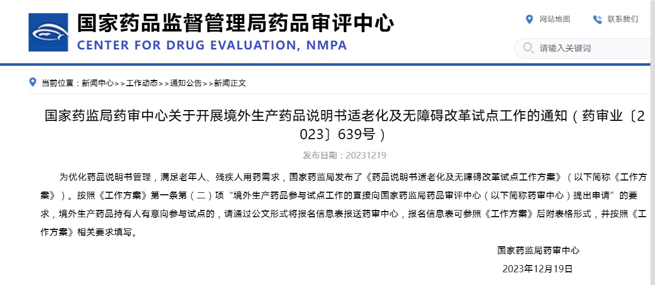 國家藥監(jiān)局藥審中心關(guān)于開展境外生產(chǎn)藥品說明書適老化及無障礙改革試點工作的通知(藥審業(yè)〔2023〕639號)