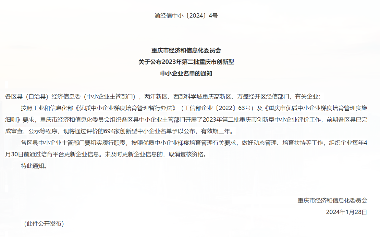 按照工業(yè)和信息化部《優(yōu)質(zhì)中小企業(yè)梯度培育管理暫行辦法》(工信部企業(yè)〔2022〕63號(hào))及《重慶市優(yōu)質(zhì)中小企業(yè)梯度培育管理實(shí)施細(xì)則》要求,重慶市經(jīng)濟(jì)和信息化委員會(huì)組織各區(qū)縣中小企業(yè)主管部門(mén)開(kāi)展了2023年第二批重慶市創(chuàng)新型中小企業(yè)評(píng)價(jià)工作,經(jīng)過(guò)嚴(yán)格的審查、公示等程序,新領(lǐng)先(重慶)醫(yī)藥科技有限公司成功獲評(píng)“重慶市創(chuàng)新型中小企業(yè)”。