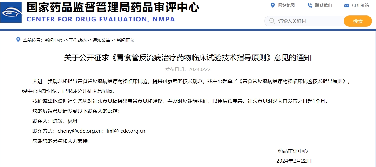 關(guān)于公開征求《胃食管反流病治療藥物臨床試驗(yàn)技術(shù)指導(dǎo)原則》意見的通知