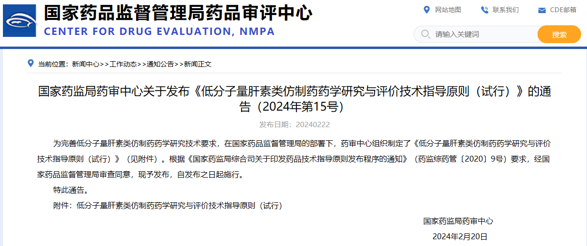 國(guó)家藥監(jiān)局藥審中心關(guān)于發(fā)布《低分子量肝素類仿制藥藥學(xué)研究與評(píng)價(jià)技術(shù)指導(dǎo)原則(試行)》的通告(2024年第15號(hào))