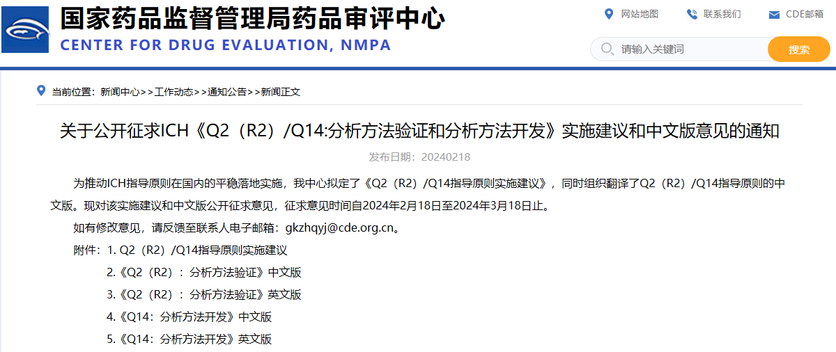 關(guān)于公開征求ICH《Q2(R2)/Q14:分析方法驗(yàn)證和分析方法開發(fā)》實(shí)施建議和中文版意見的通知